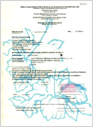 | マレーシア | マレーシア健康省から認可を受けた医薬品(漢方薬)。 |