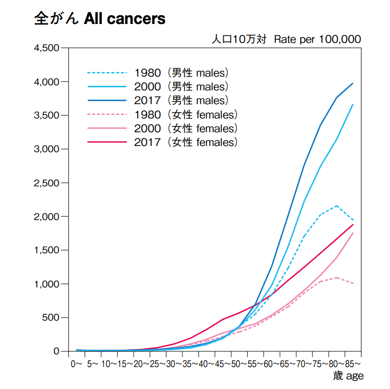 このように年齢の増加に伴い右肩上がりで罹患率が上昇しています。がんは高齢者に多い病気であると言うことが出来るでしょう。